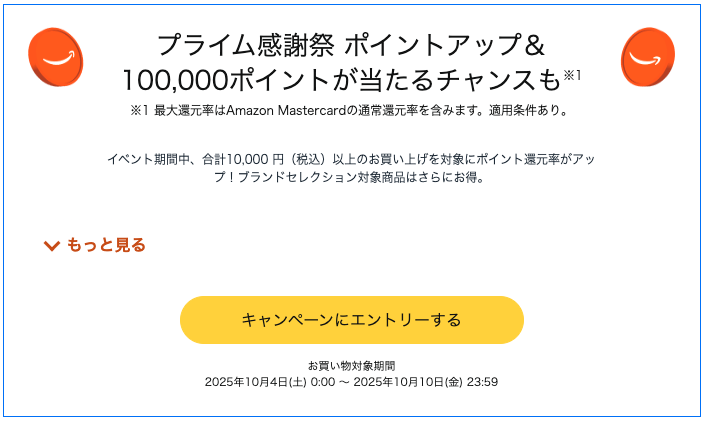 Amazonにて年に1回の大セール「Amazonプライム感謝祭(2025)」が、Amazonプライム会員限定で10月7日(火)0:00から10日(金)23:59まで開催します。